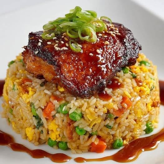 Brown Sugar Bourbon Chicken Thighs on Chinese Fried Rice