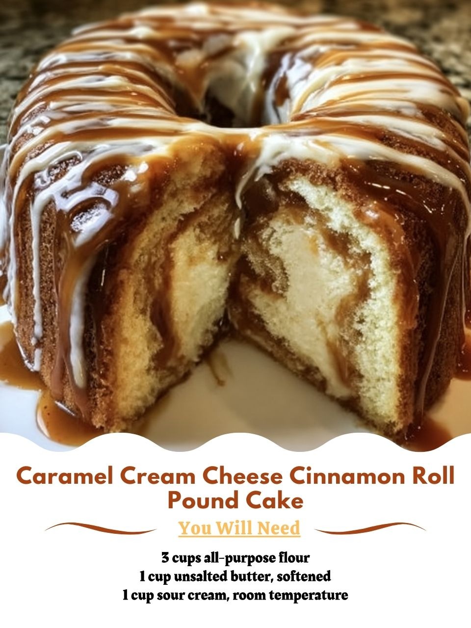 Pound cake has its origins in Europe, traditionally made with equal parts of flour, butter, eggs, and sugar. Over time, it evolved into richer, more complex versions in the U.S., often enhanced with sour cream or cream cheese for added moisture. This recipe takes the classic concept of pound cake and infuses it with the flavors of cinnamon rolls and cheesecake—two beloved comfort foods—then tops it with caramel for a modern, indulgent twist.