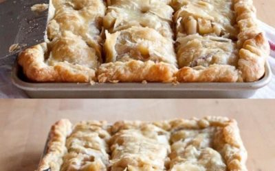 Apple slab pie is a great dessert for a party! It’s a big apple pie baked on a large flat pan and cut into squares…